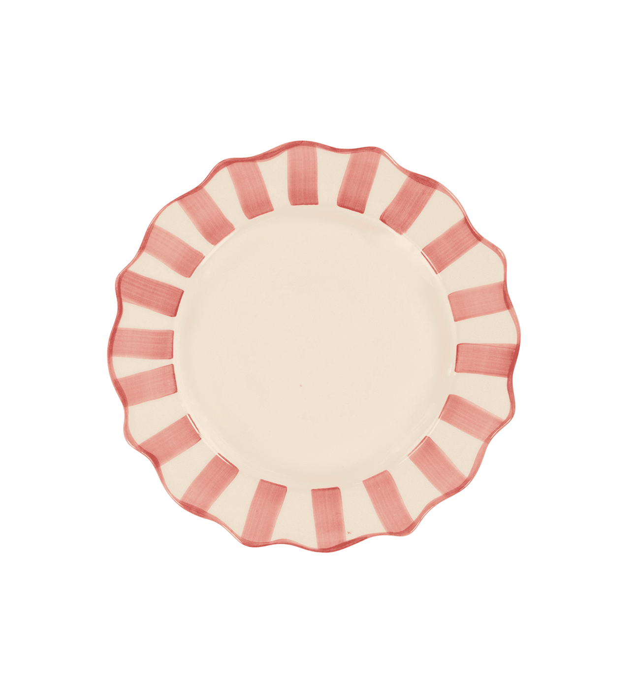 - The Pink Scalloped Breakfast Plate has a fun, vibrant design that effortlessly brightens up your table setting. The hand-painted stripes around the outer circle of the plates make the item playful and extraordinary.