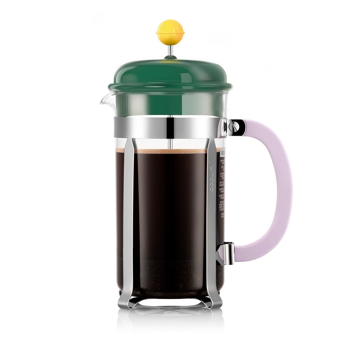 - The chrome-plated stainless steel frame protects the glass carafe, while the plastic lid and handle offer safe and comfortable handling