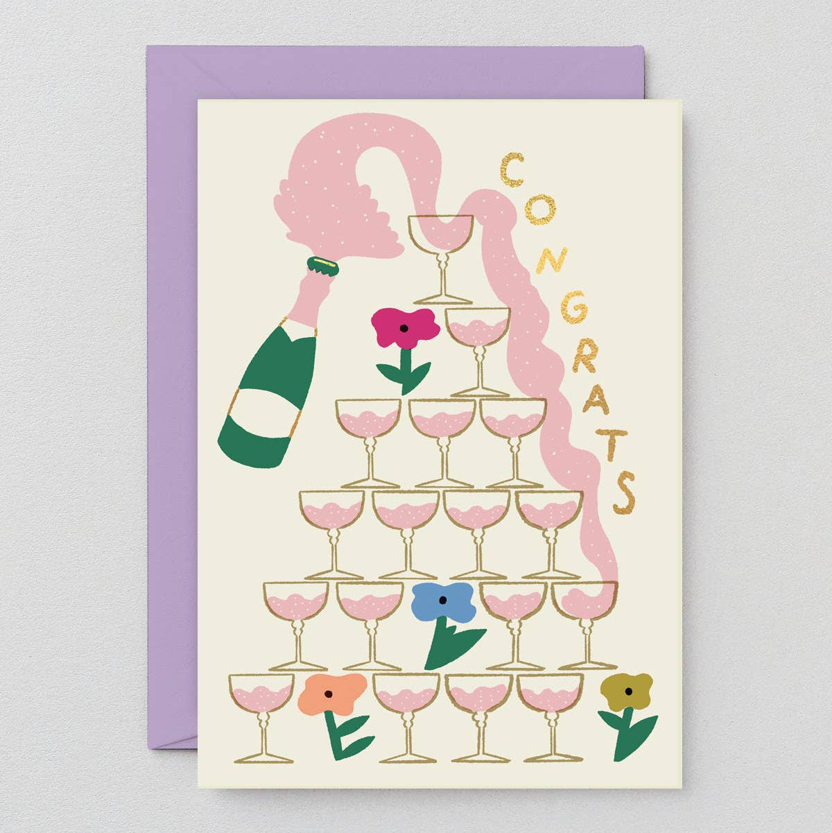 - This elegant array of bubbles and blooms adds a touch of sophistication to any congratulatory wishes. Designed in pretty pink and pastels with gold foil finishing