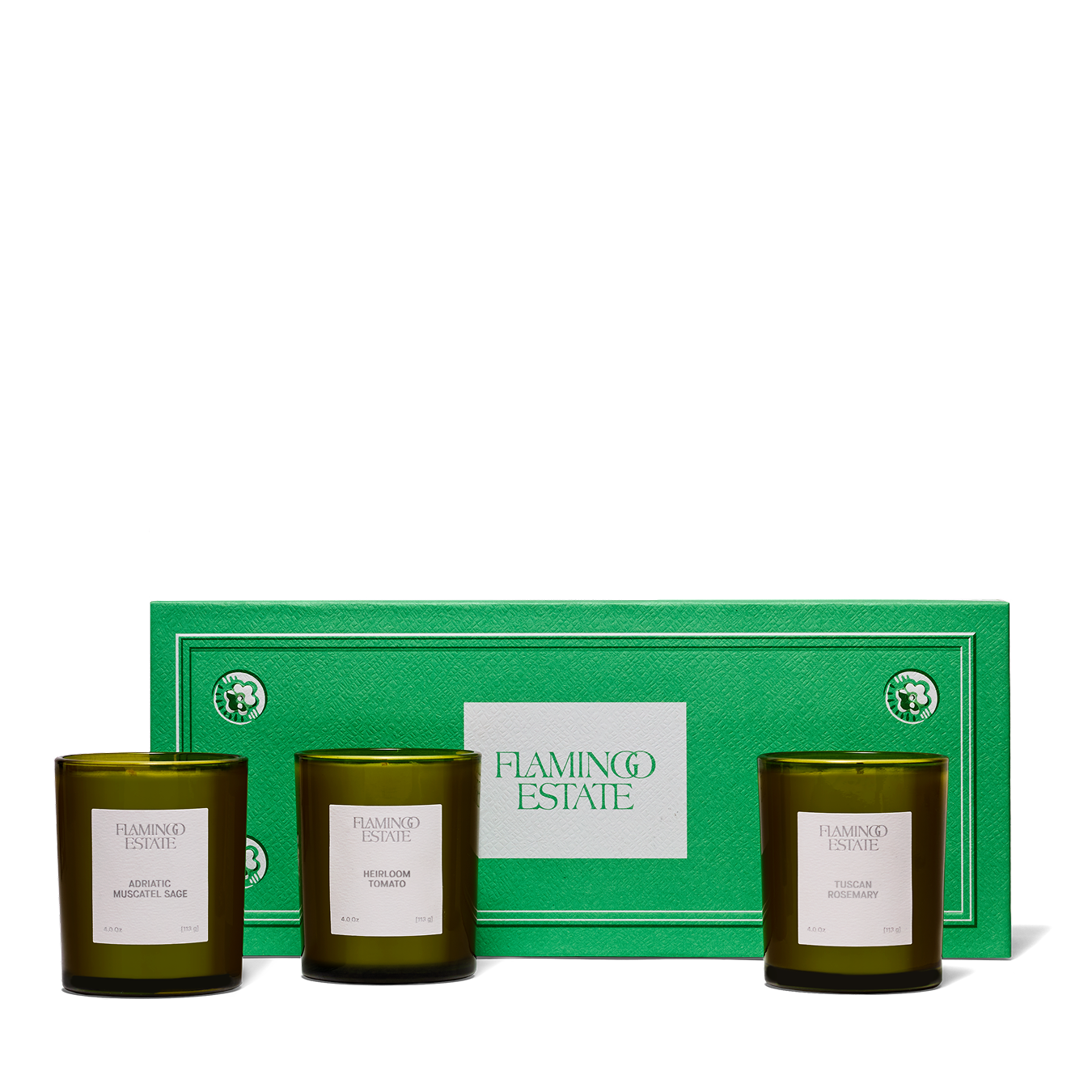 - The three most popular scents from Flamingo Estate. Rosemary, Sage, and Tomato plants tingle your nose and push you along the pathways, hand-poured in petite glass vessels so you can light them all at once and create ambiance, gift them, or try them