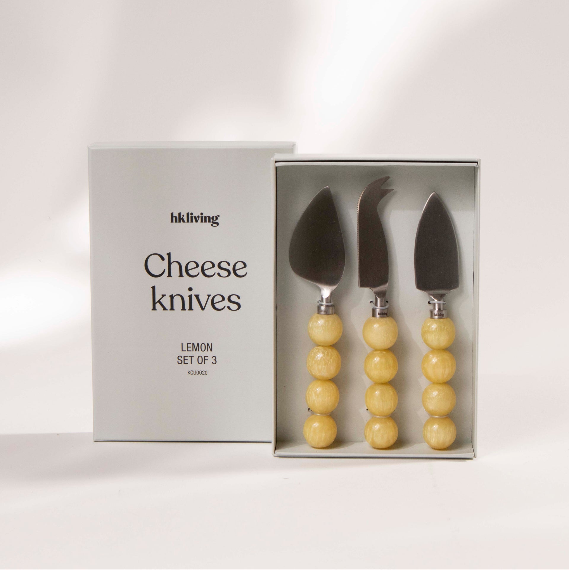 - This set of three cheese knives blends playful resin handles with functional stainless steel blades — perfect for adding character to any cheese board or aperitif moment. Each knife has its own unique shape, making them ideal for soft, hard or crumbly cheeses.