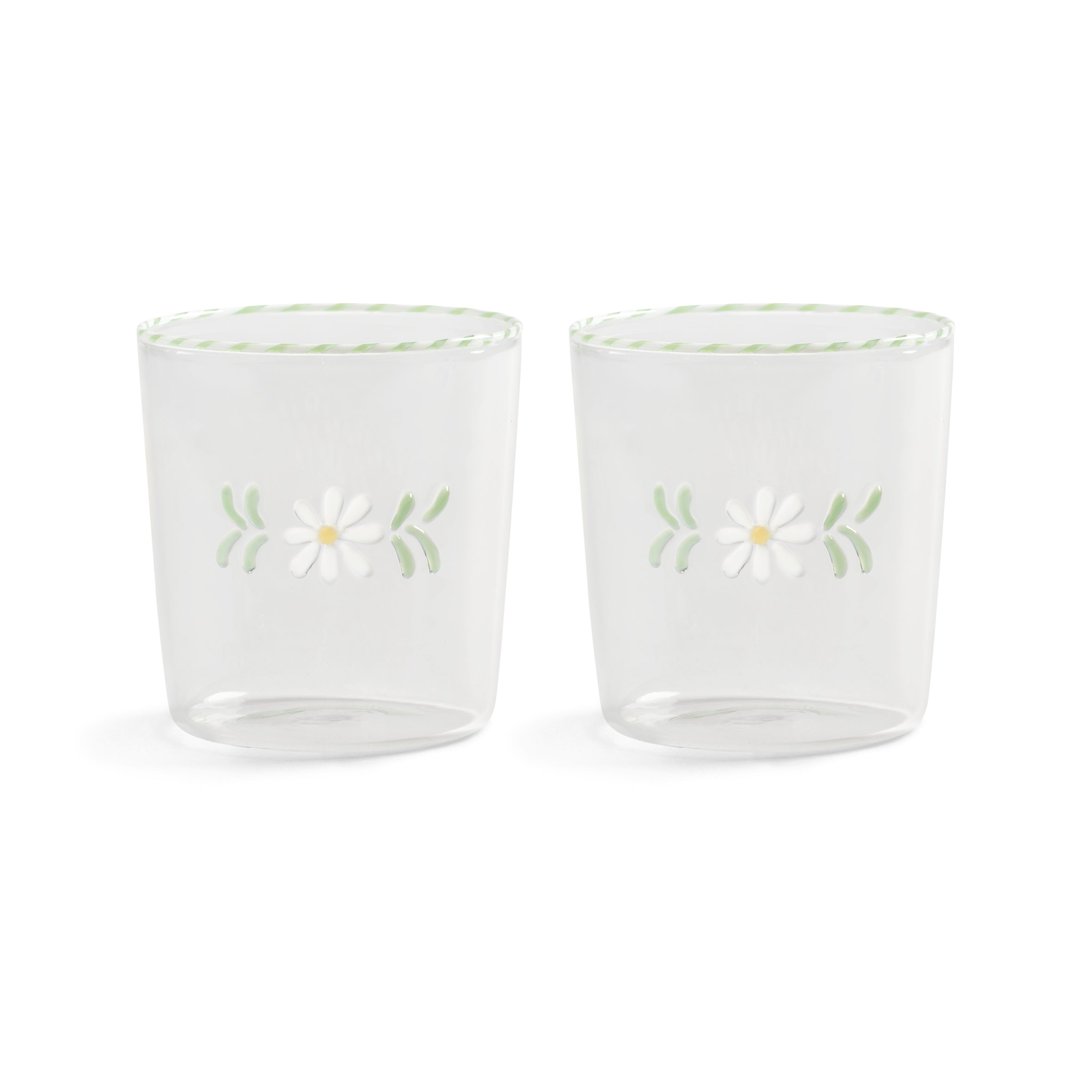 - Meet the Flora water glasses, crafted from durable borosilicate glass and adorned with hand-placed flowers and leaves, inspired by Scandinavian folk patterns. Each glass features a unique twist—literally—with two colors blending into one on the rim and finished in white
