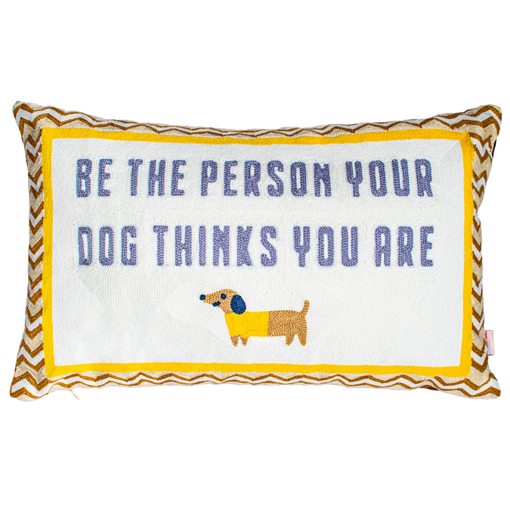 - This dog-lover favourite cushion features the heartwarming slogan “Be the person your dog thinks you are” on the front in needlepoint and a plush brown velvet back. It is reversible