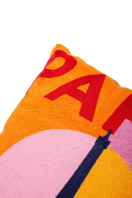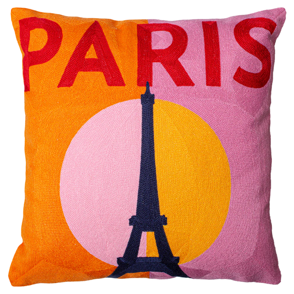 - Inspired by the romantic energy of Paris, this striking needlepoint cushion showcases the iconic Eiffel Tower set against a vibrant pink and orange abstract backdrop adding warmth and contemporary flair to your space. It is reversible