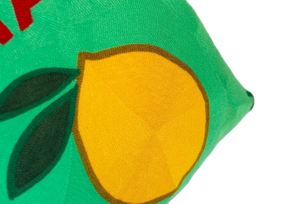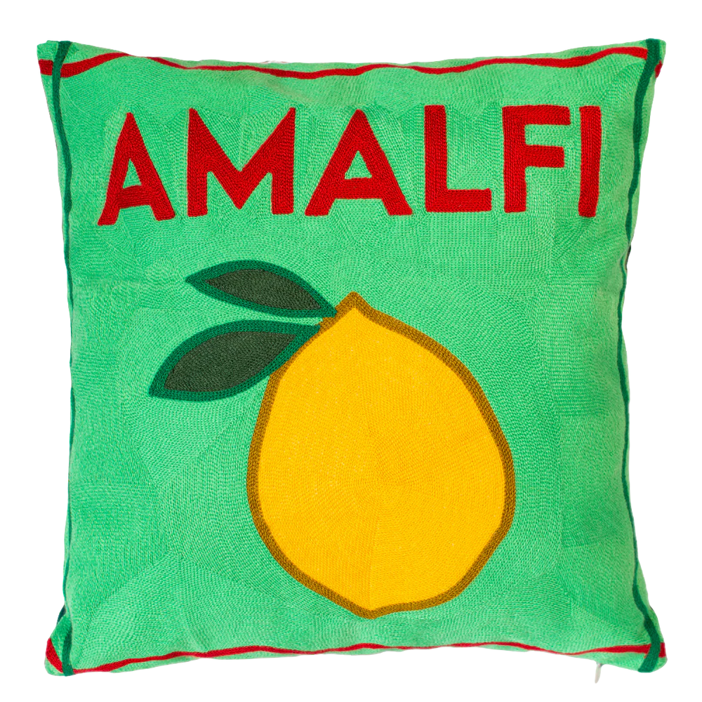 - Transport yourself to the glamour of the Amalfi Coast with this striking cushion featuring a bold lemon design on the front and a luxury green velvet back, perfect for adding Mediterranean zest to your living room or bedroom. It is reversible