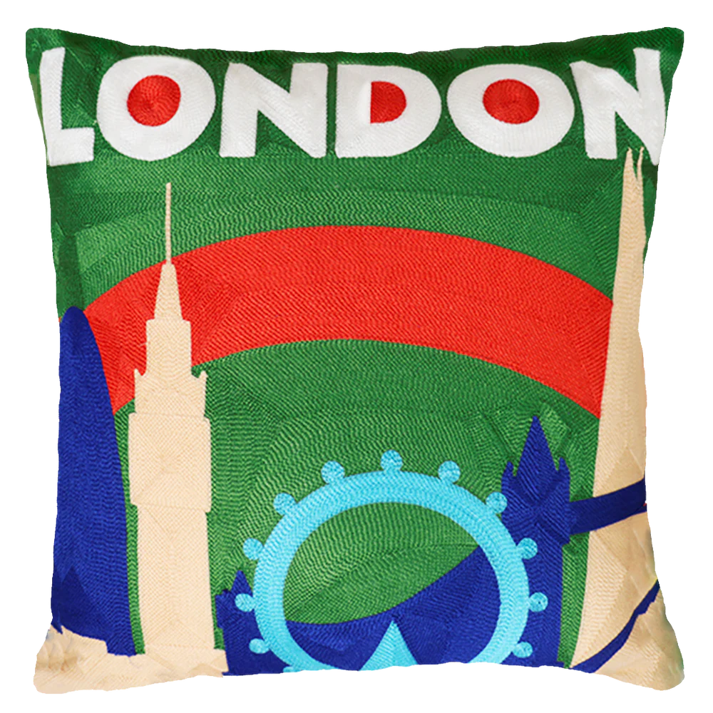 - Showcasing an iconic London skyline in vibrant needlepoint, this cushion captures British charm and cosmopolitan style, perfect for travel lovers and city‑inspired interiors. It has a luxurious blue velvet back that complements the bold stitched design on the front. It is reversible